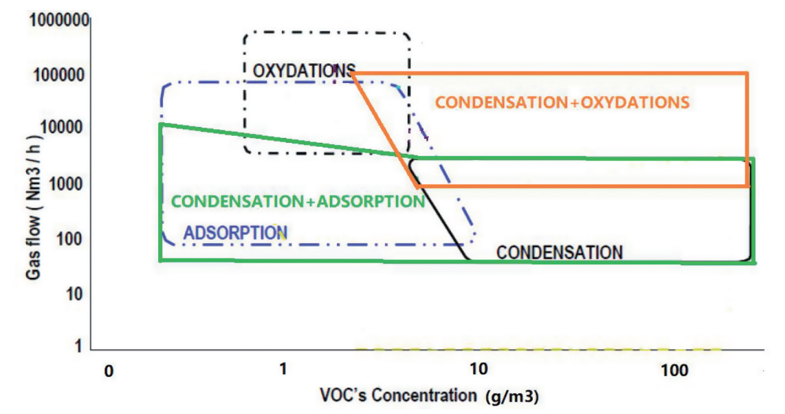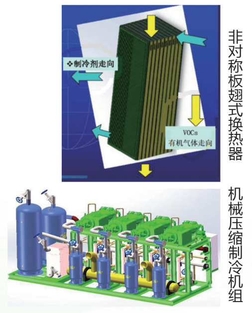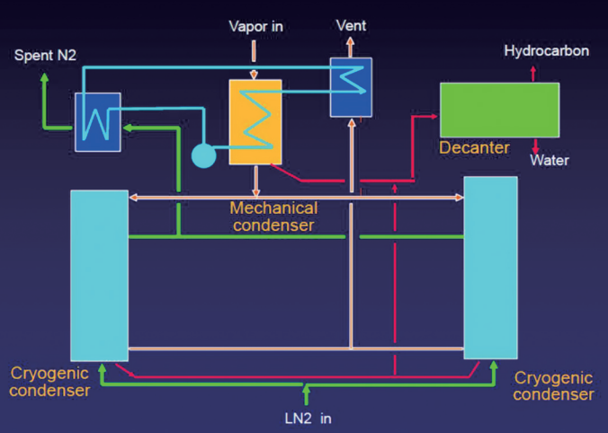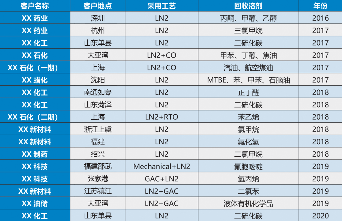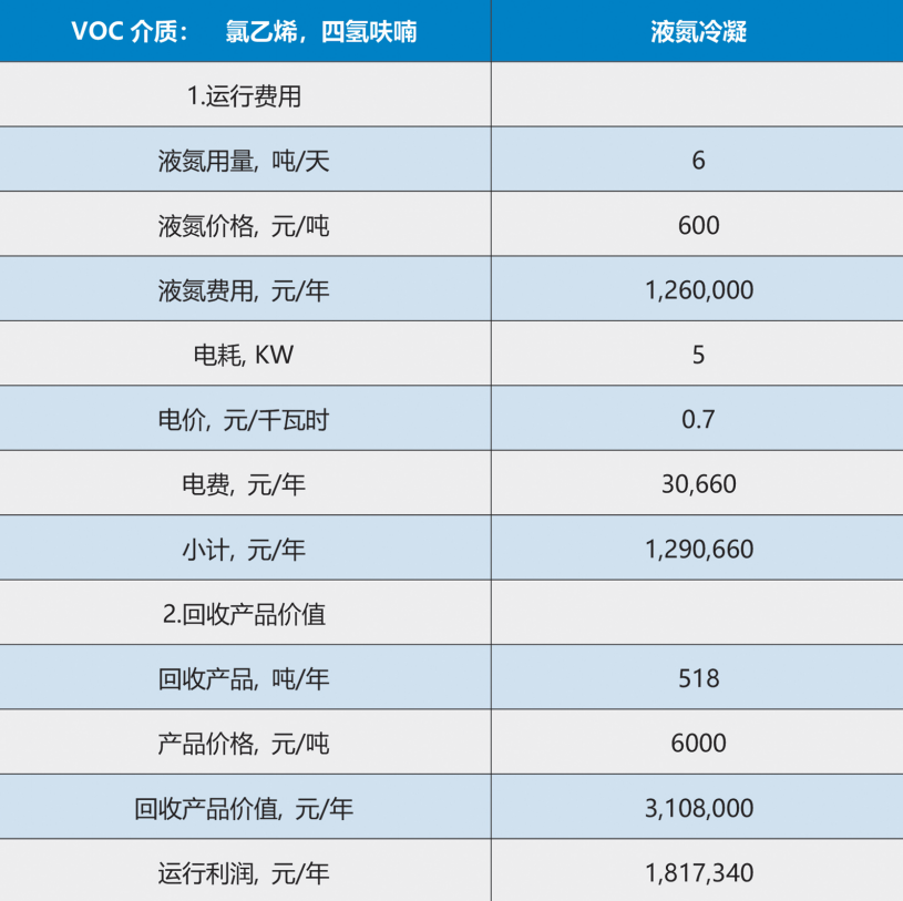 在溶剂回收和VOC处理中,机械压缩制冷(3℃、-30℃和-70℃)可以回收70~80%的溶剂和VOC,但不能达标排放。机械制冷+液氮冷凝组合即能满足排放要求,又能大幅度降低液氮消耗。通常机械制冷冷凝置于液氮冷凝单元之前,或利用工厂富裕冷冻水,通过三级冷凝,将大部分溶剂或VOC分级冷凝回收,然后进入液氮冷凝进行末端处理,达标后排放。